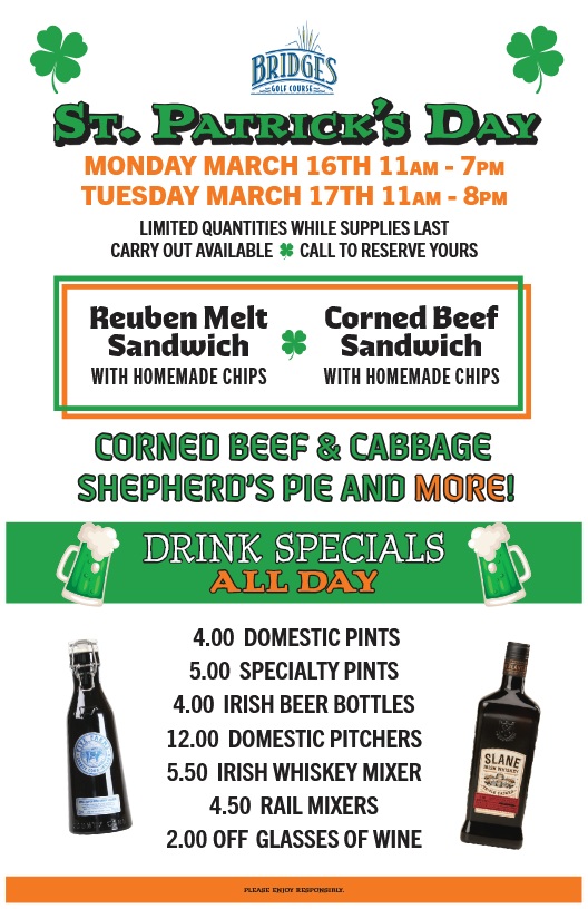Join us for our St Patrick’s Day Specials, carry out or dine in! Only limited quantities, so get it before its gone. Information in the picture below.