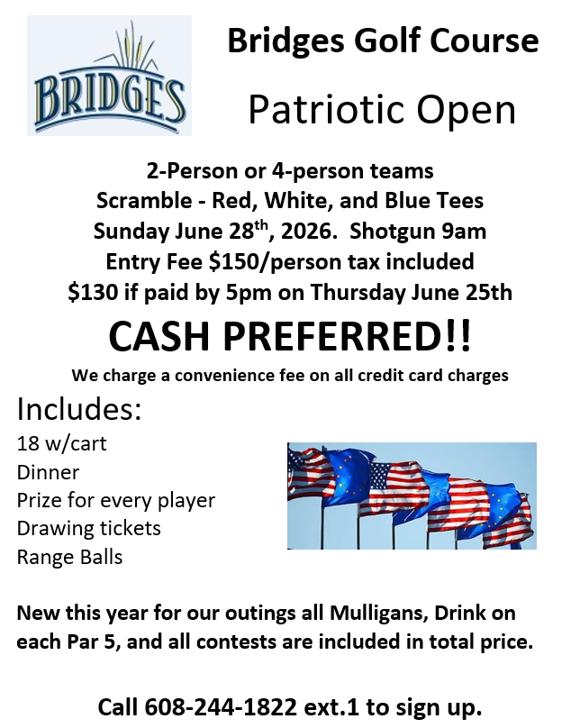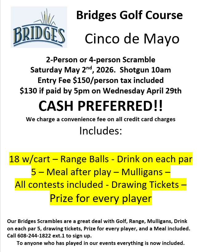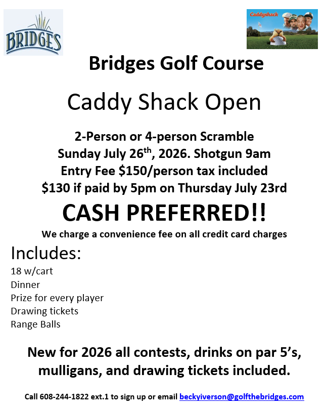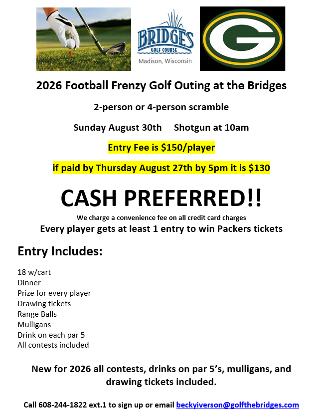Call 608-244-1822 ext. 1 or Email Becky at beckyiverson@golfthebridges.com to sign up