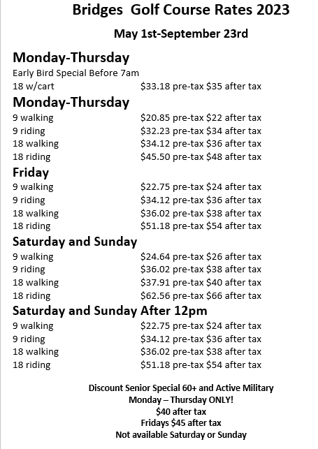 Rates at the course are auto priced, the rates below are a baseline but can be lower or higher depending on how busy we are. Special rates are not available online you must call to make a tee time for any discounted round. We will not lower the prices once you have pre-paid for a higher price if the price is reduced.